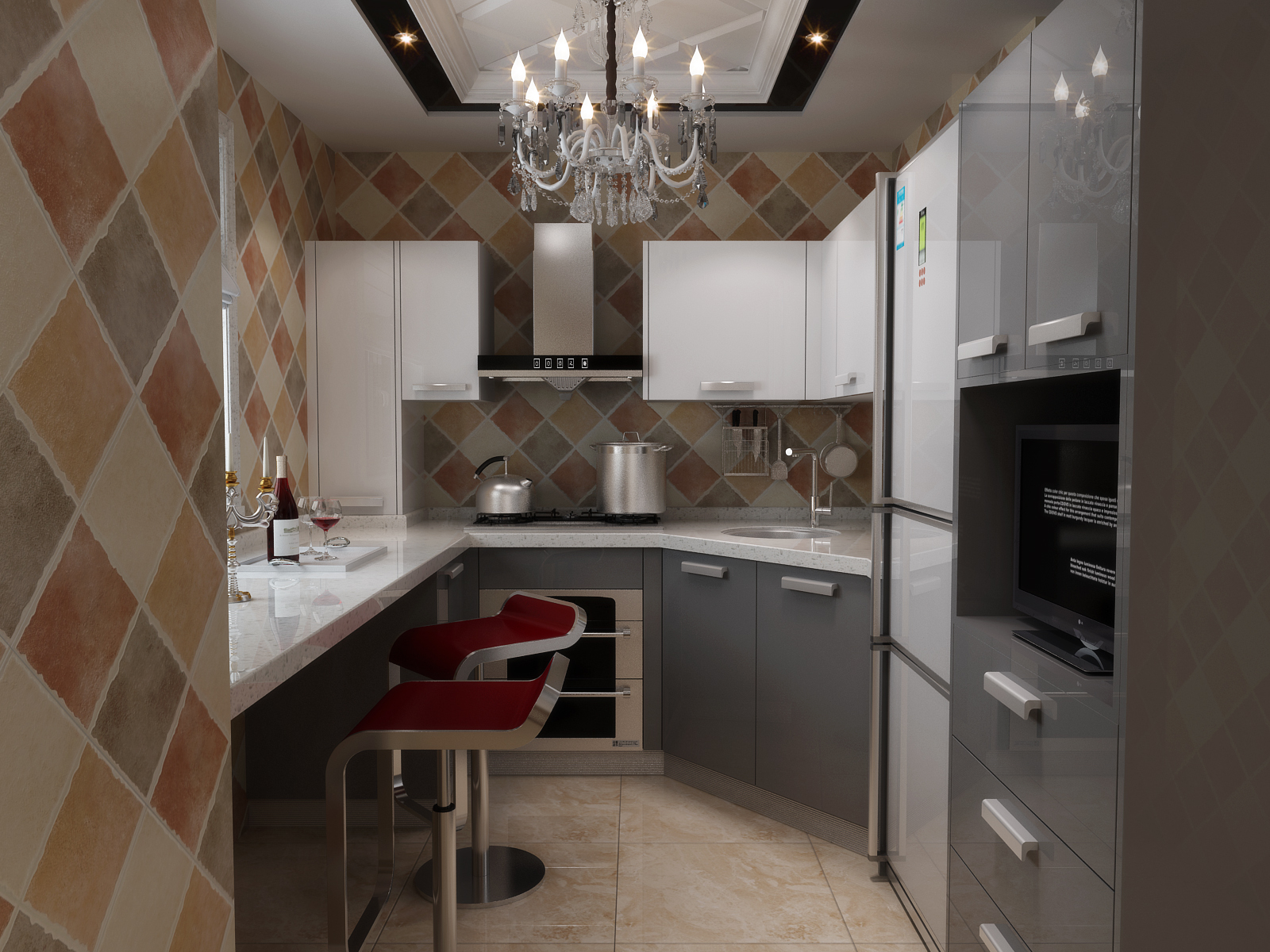 Modern European Style Small Modular Gray Glossy Kitchen Cabinet With White Quartz Countertop